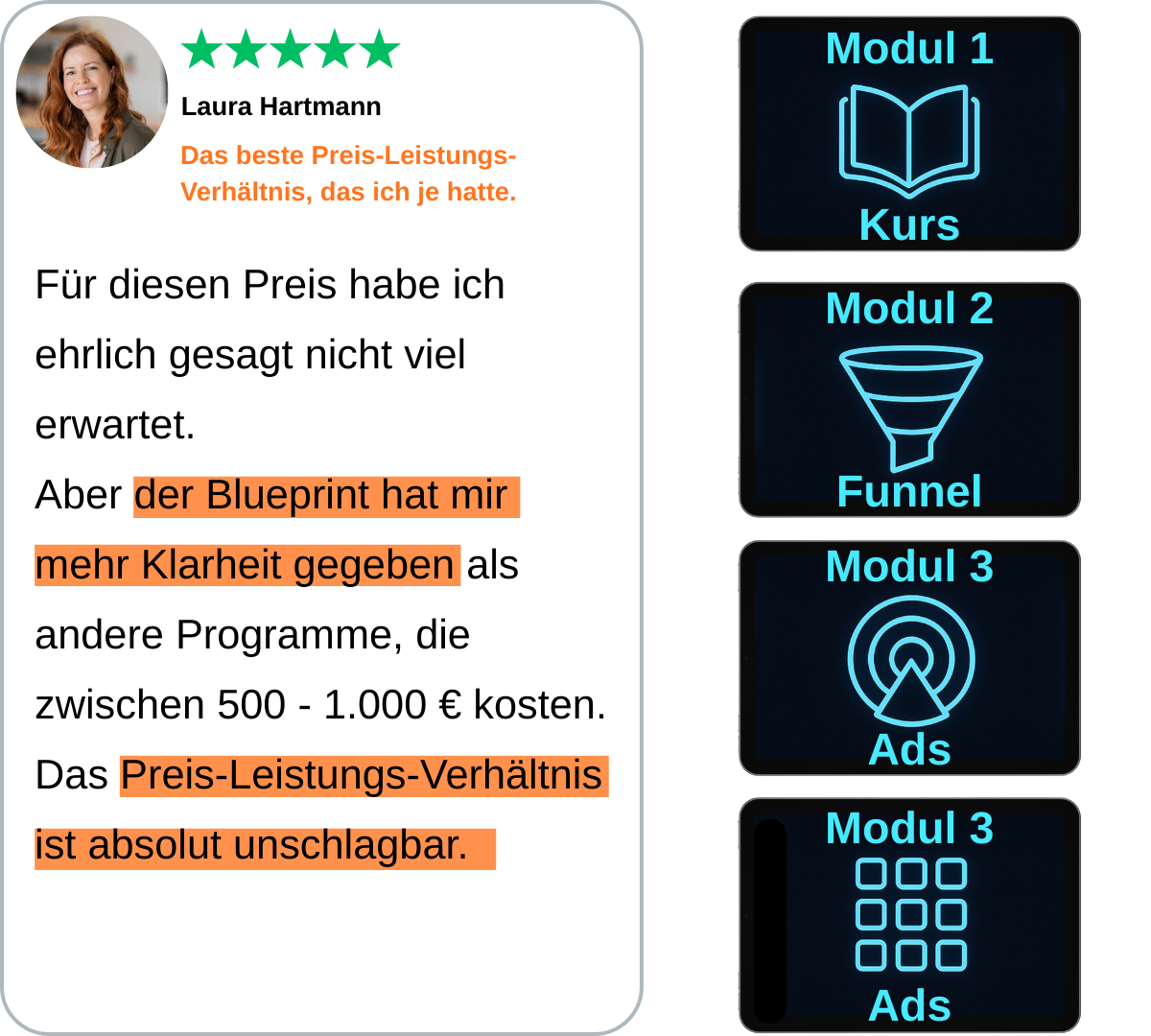 Kein Problem. Der Blueprint funktioniert auch ohne Reichweite, weil du lernst, wie ein System verkauft – nicht deine Followerzahl.